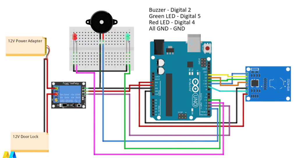 In this project, we’ll build a Solenoid Door Lock Control System using Arduino and an RFID RC522 module. This system allows door access only to users with authorized RFID cards. When an authorized card is detected, the relay activates, unlocking the 12V solenoid lock for a short time.